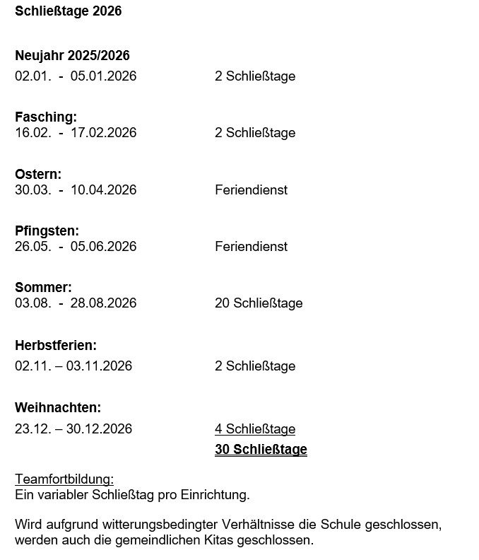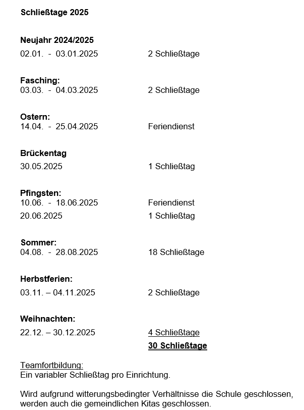 Während des Kindergartenjahres vom 1. September bis 31. August des darauffolgenden Jahres ist die Einrichtung an 30 Tagen geschlossen.